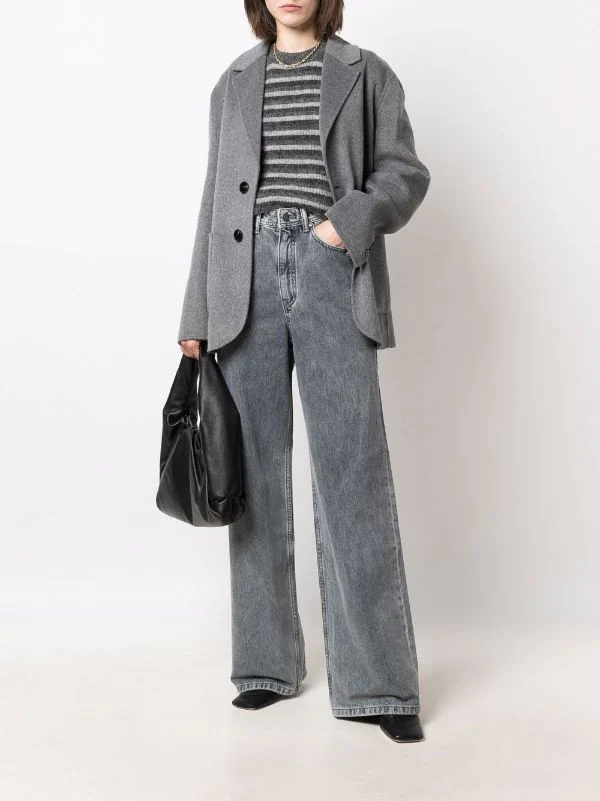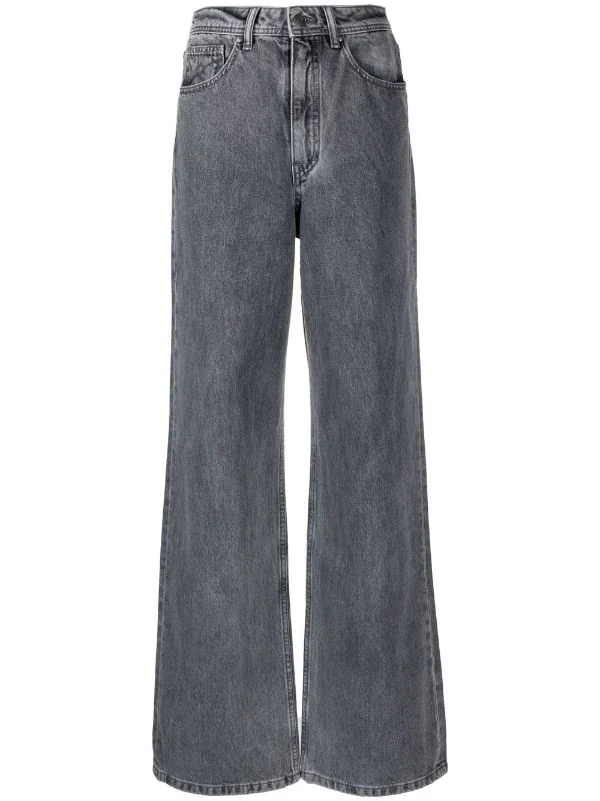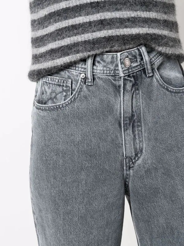 Taille haute, passants de ceinture, fermeture à zip et boutons sur le devant, cinq poches classiques, coupe ample, patch logo sur l’arrière. Couleur : gris. Matière : coton.