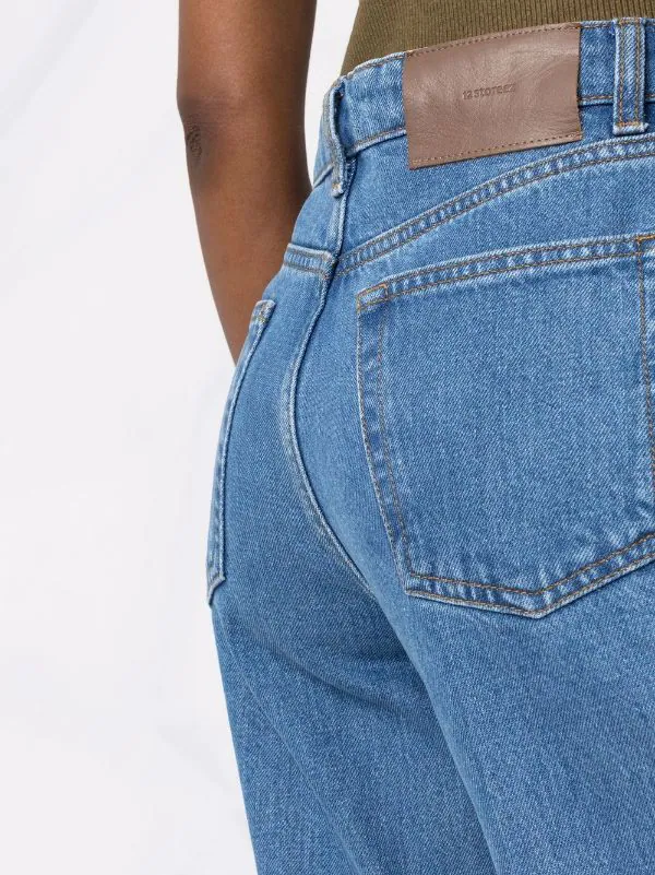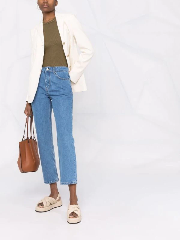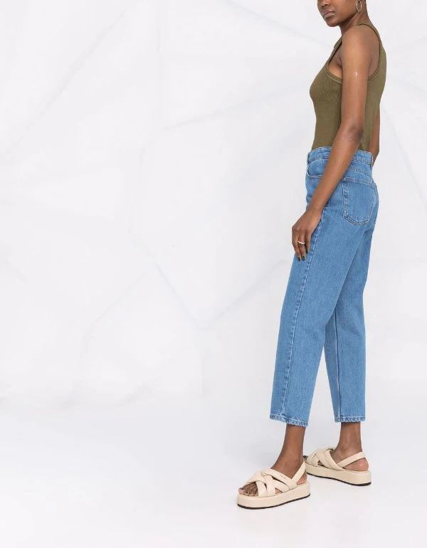 Taille mi-haute, longueur crop, coupe droite, passants de ceinture, fermeture dissimulée sur le devant, cinq poches classiques. Couleur : bleu.