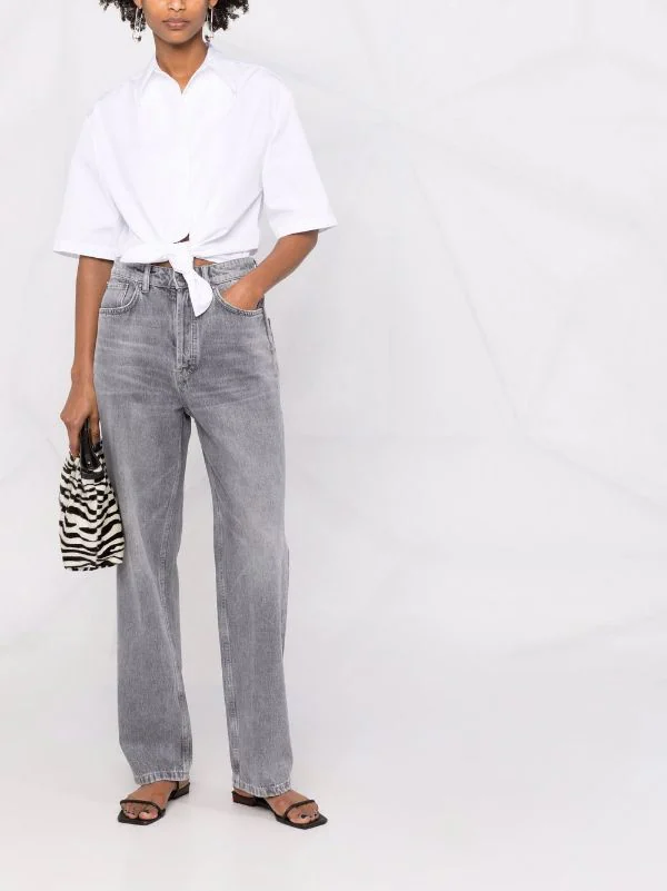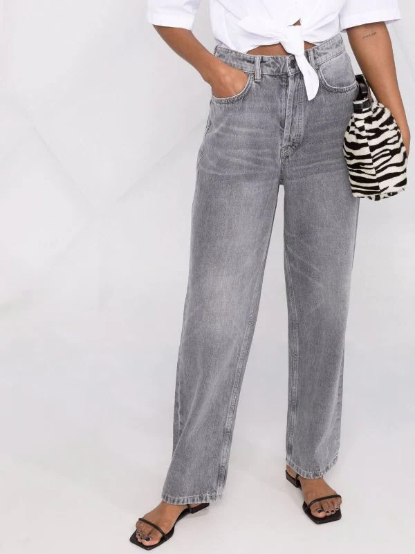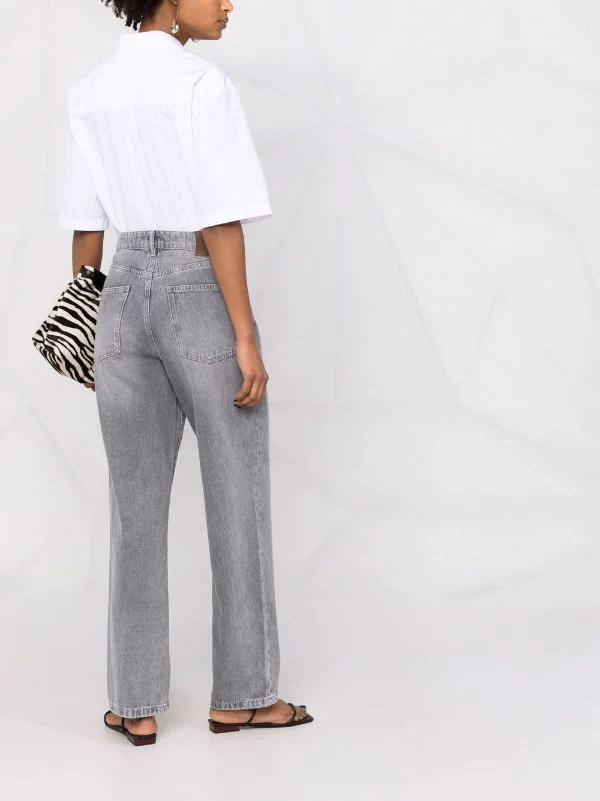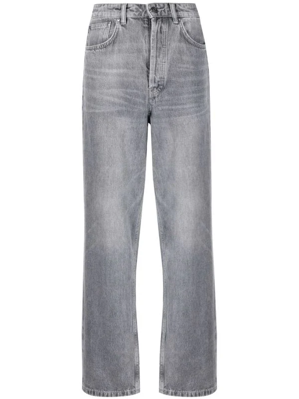 Coupe droite, effet délavé, patch logo sur l’arrière, passants de ceinture, fermeture à braguette dissimulée et bouton, cinq poches classiques. Couleur : gris. Matière : coton biologique.