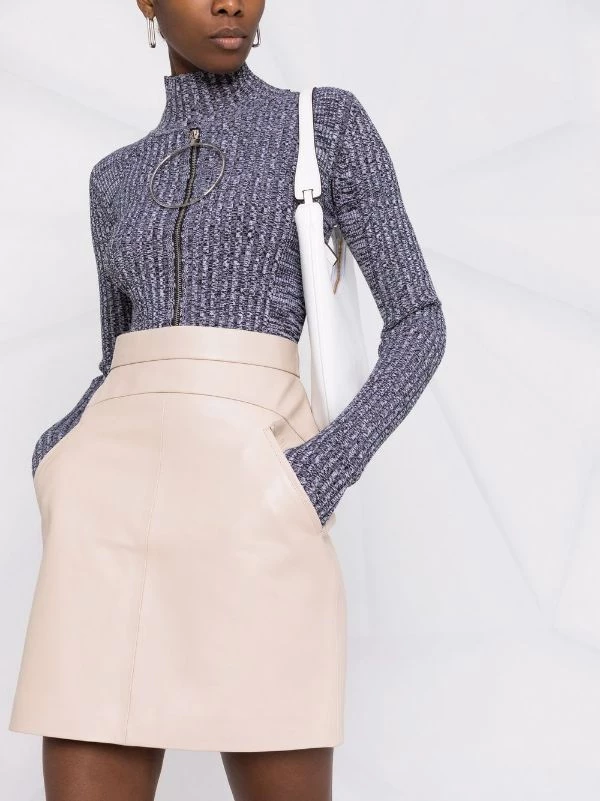 Design à empiècements, taille haute, coupe trapèze, fermeture zippée à l’arrière, deux poches latérales fendues, coupe courte. Matière : peau d’agneau.