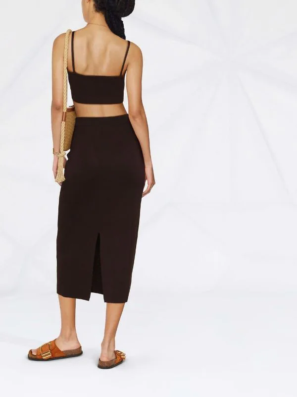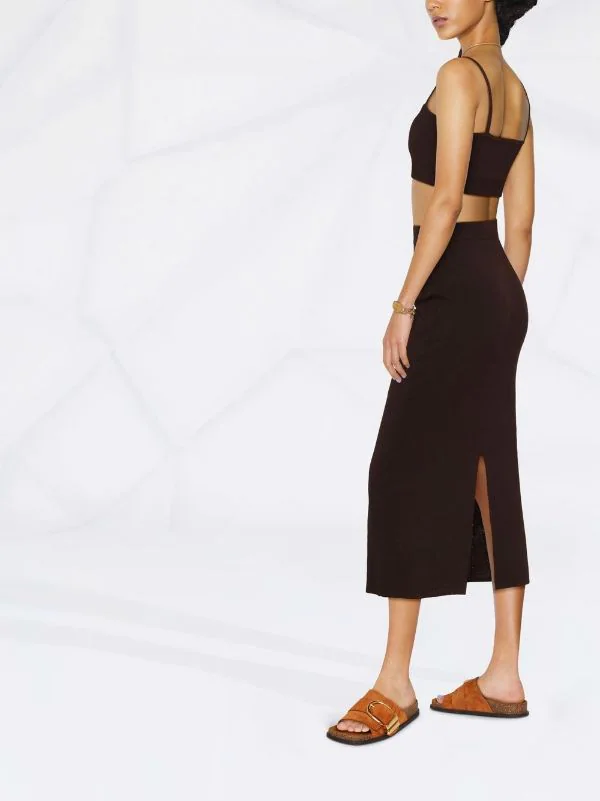 Maille fine, taille haute, coupe mi-longue, fente à l’arrière, bordures nervurées. Couleur : marron.