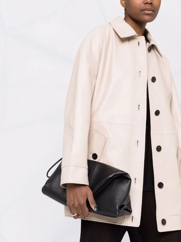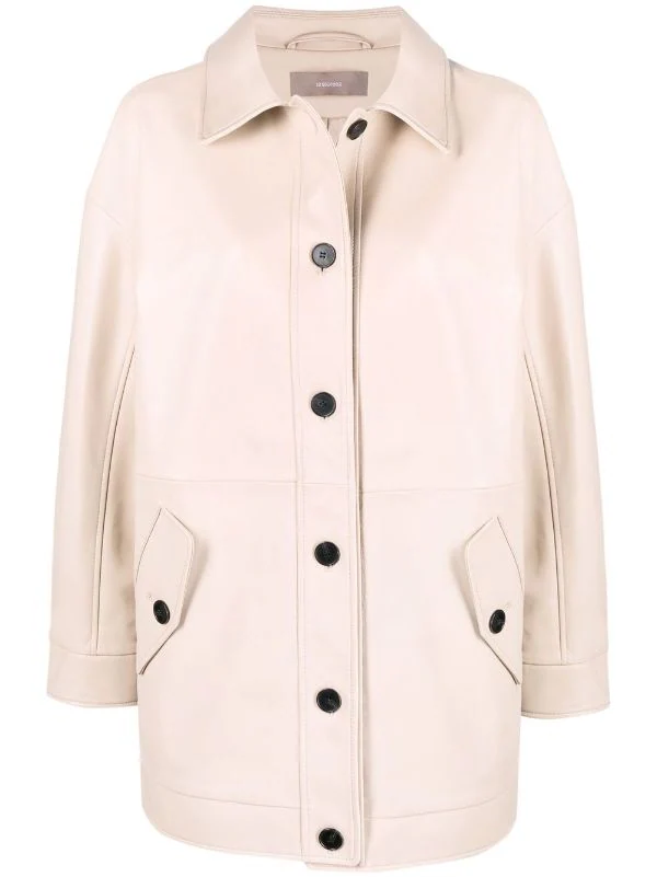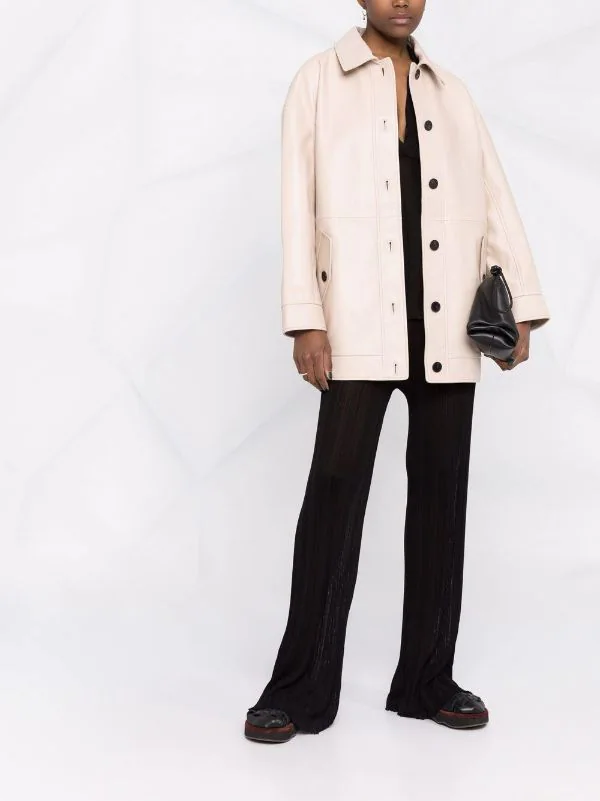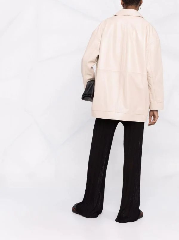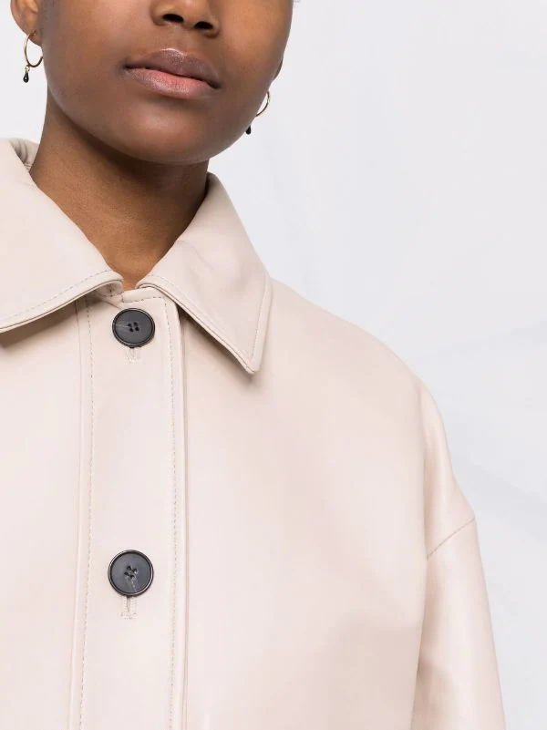 Design ton sur ton, design à empiècements, col classique, épaules tombantes, boutonnière sur le devant, manches longues, deux poches latérales boutonnées, ourlet droit. Matière : peau d’agneau.