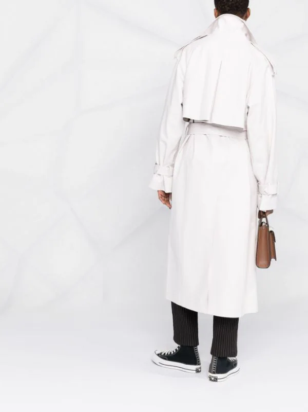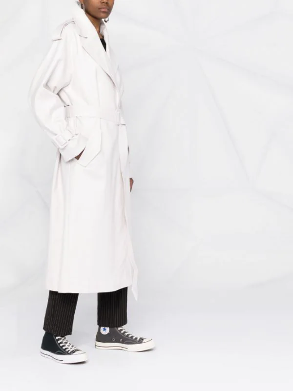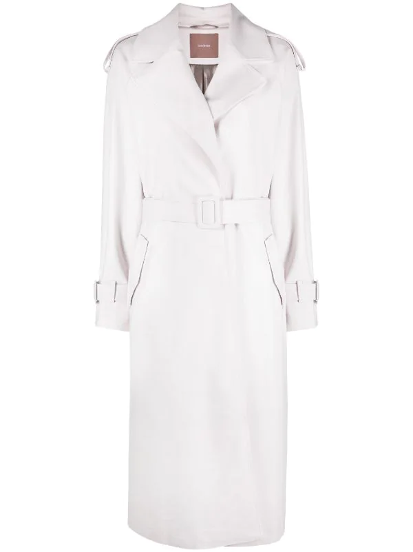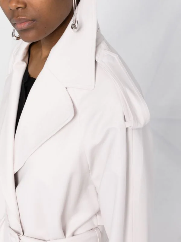 Taille ceinturée, revers crantés, poches latérales fendues, manches longues, fente arrière centrale, coupe mi-longue.