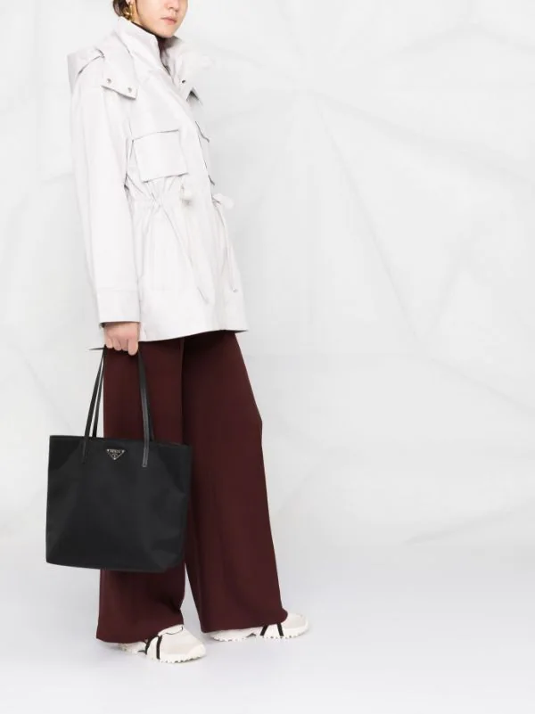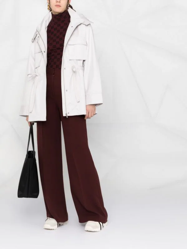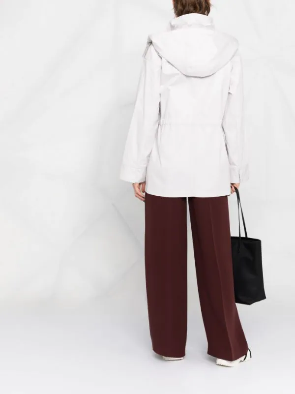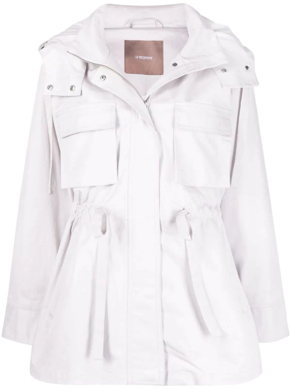 Capuche détachable, deux poches poitrine plaquées, lien de resserrage à la taille, poches latérales fendues, manches longues. Couleur : gris. Matière : coton.