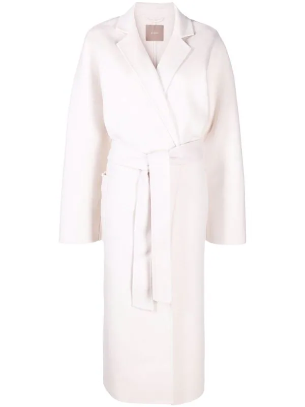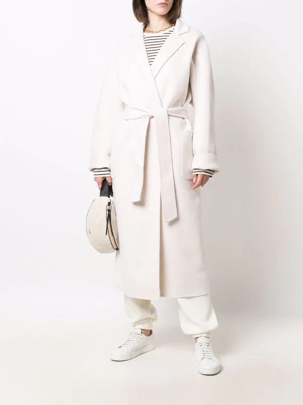 Revers crantés, épaules tombantes, manches longues, taille ceinturée, coupe mi-longue, poches plaquées latérales. Couleur : blanc.