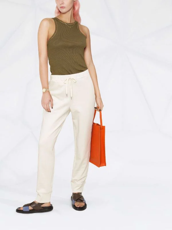 Taille élastique à lien de resserrage, deux poches latérales fendues, coupe fuselée. Matière : coton.