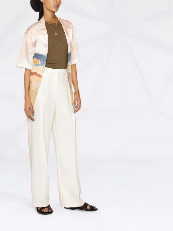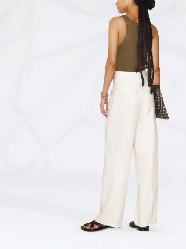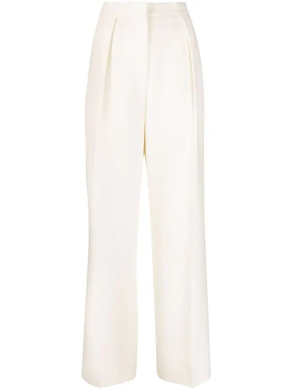 Plis marqués, taille haute, poches arrière passepoilées, deux poches latérales fendues, fermeture dissimulée sur le devant.