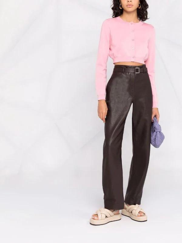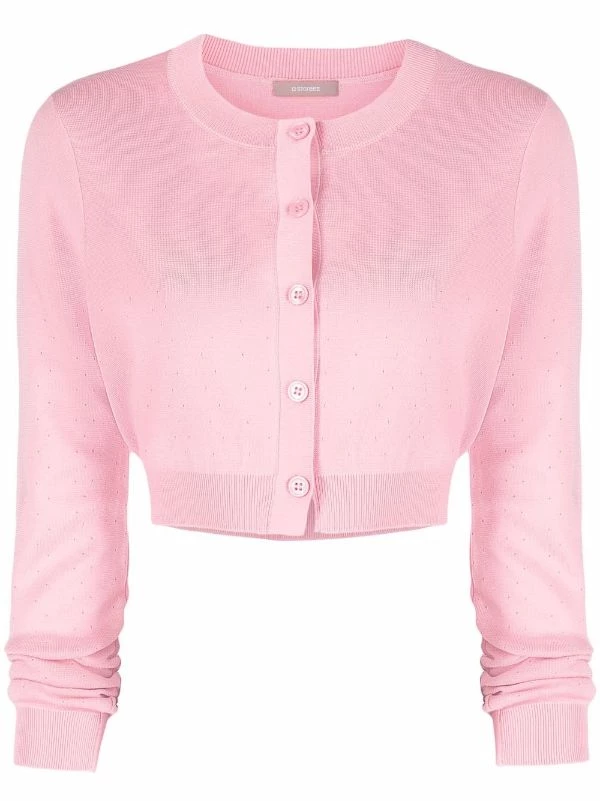Design en maille, maille fine, manches longues, encolure ronde, coupe courte, boutonnière sur le devant, bordures nervurées. Couleur : rose.