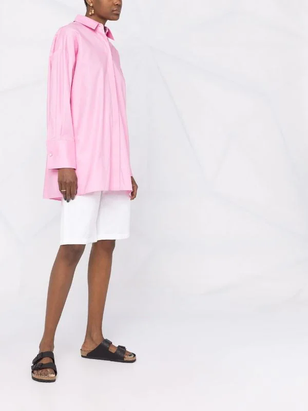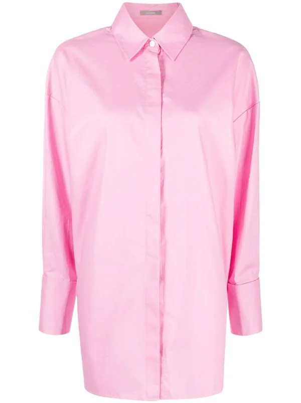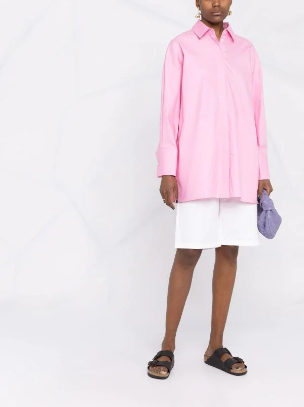 Col classique, épaules tombantes, boutonnière dissimulée sur le devant, manches longues, poignets boutonnés, ourlet incurvé au dos. Couleur : rose. Matière : coton.