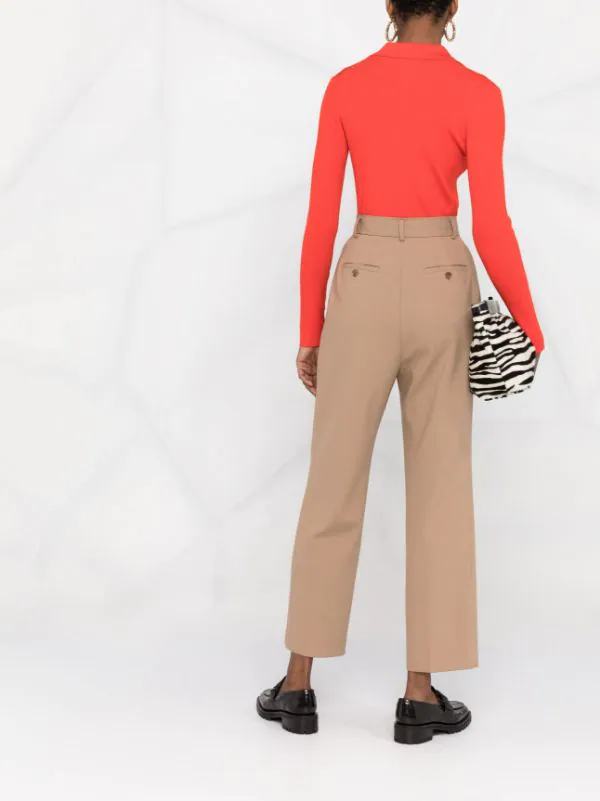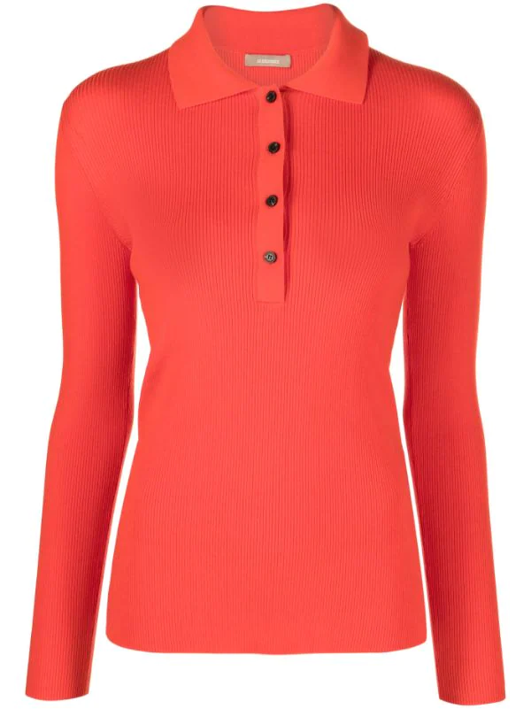 Maille nervurée, maille fine, col polo, patte de boutonnage sur le devant, manches longues, ourlet droit. Couleur : rouge.