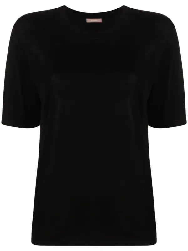 Encolure ras du cou, manches courtes, finitions nervurées. Couleur : noir. Matière : lyocell.