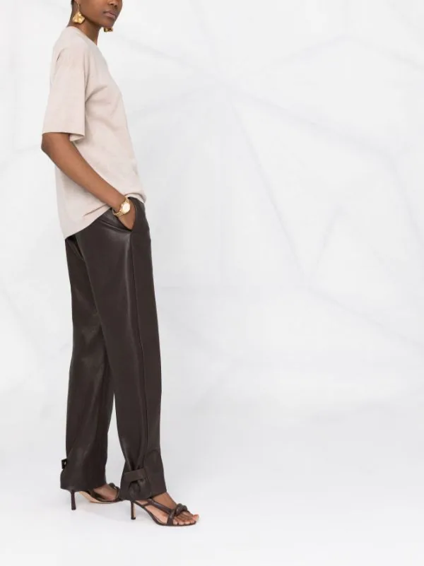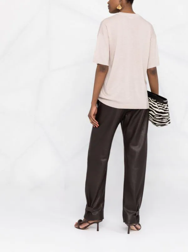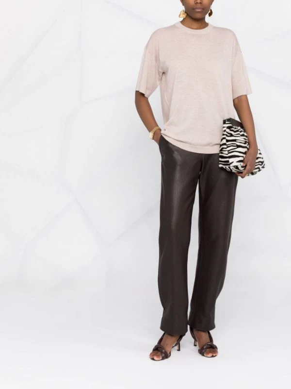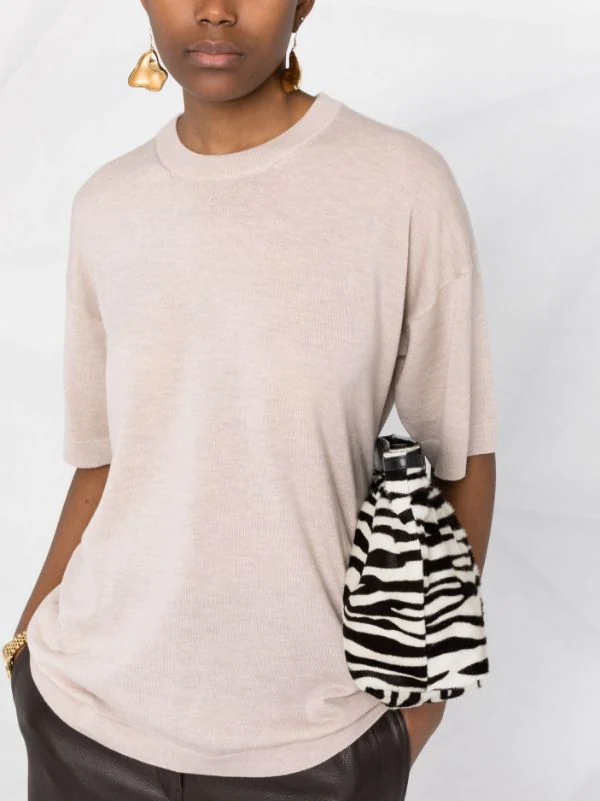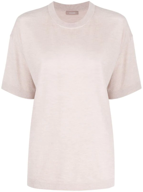 Encolure ras du cou, épaules tombantes, manches courtes, finitions nervurées. Matière : laine mérinos.