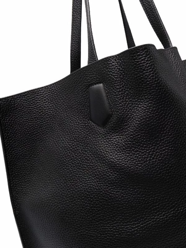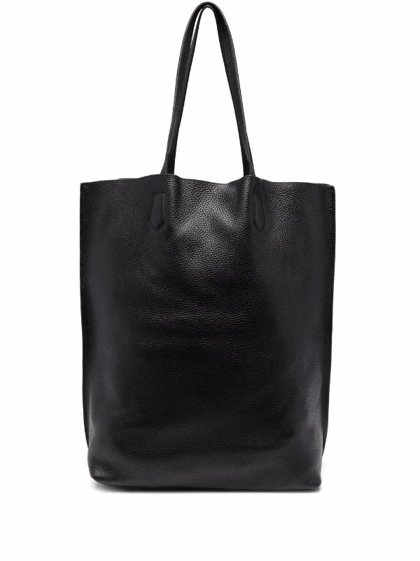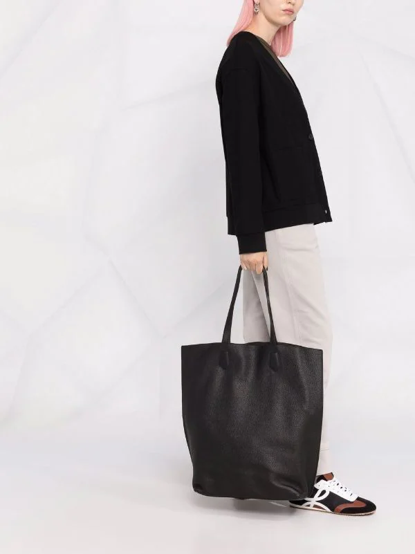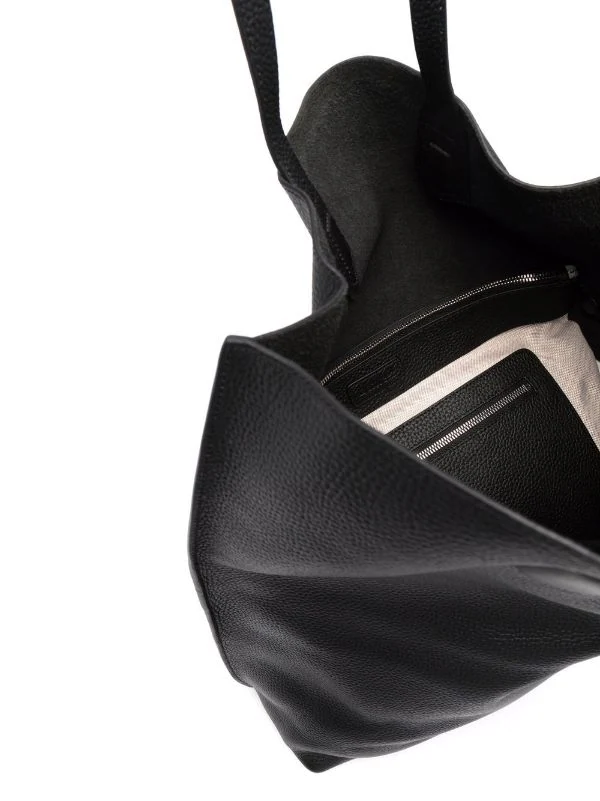 Texture grainée, deux longues anses sur le dessus, fermeture magnétique dissimulée, compartiment intérieur, poches intérieures zippées. Couleur : noir. Matière : cuir.