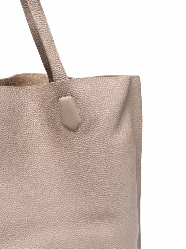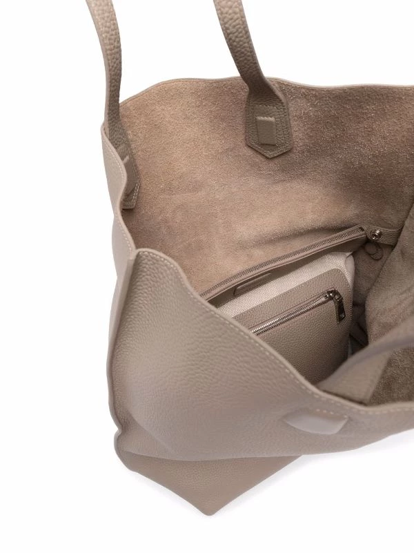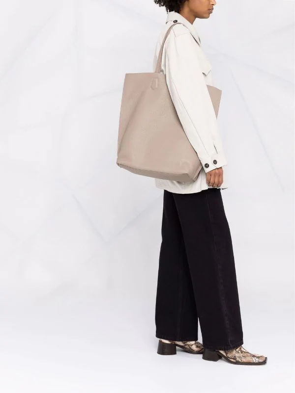 Texture grainée, deux longues anses sur le dessus, fermeture magnétique dissimulée, compartiment intérieur, poches intérieures zippées.