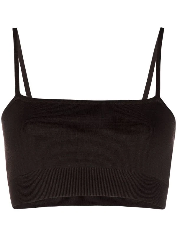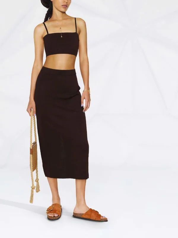 Maille fine, coupe courte, fines bretelles, bordures nervurées. Couleur : marron.