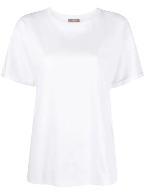 Manches courtes, encolure ronde, épaules tombantes, ourlet droit. Couleur : blanc. Matière : coton.
