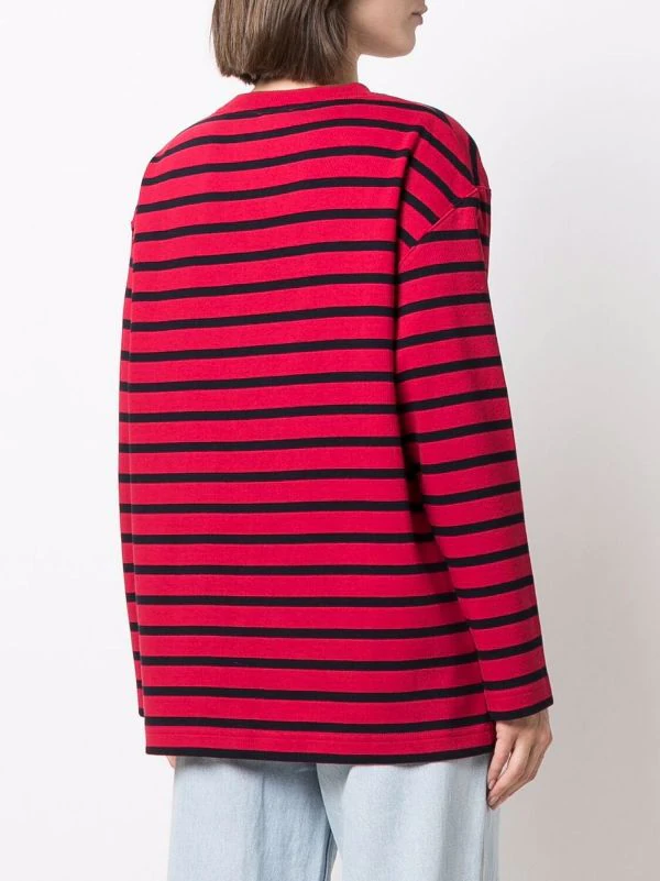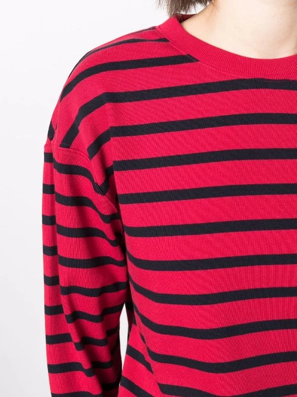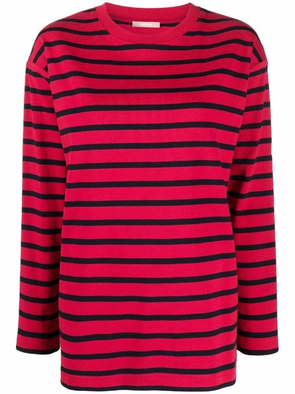 Encolure ronde, épaules tombantes, manches longues, ourlet droit, rayures horizontales imprimées. Matière : coton.
