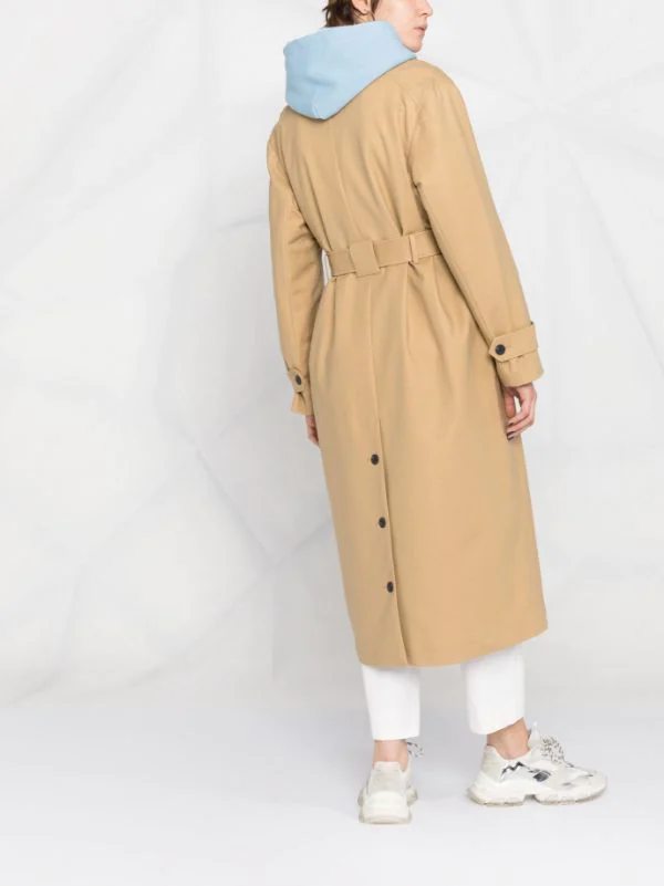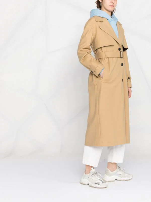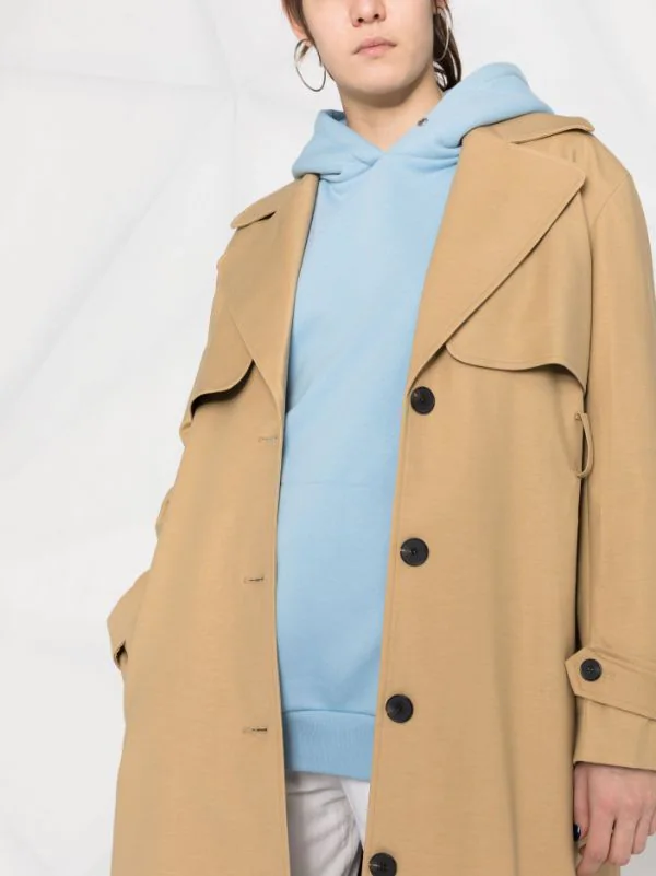 Taille ceinturée, revers crantés, boutonnière sur le devant, poches latérales fendues, manches longues, coupe mi-longue.