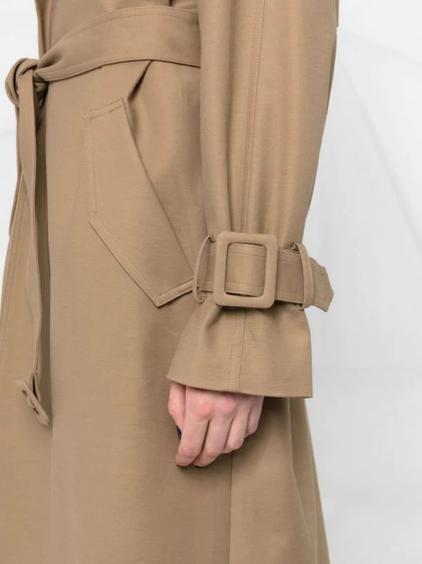 Taille ceinturée, revers crantés, poches latérales fendues, manches longues, fente arrière centrale, coupe mi-longue.