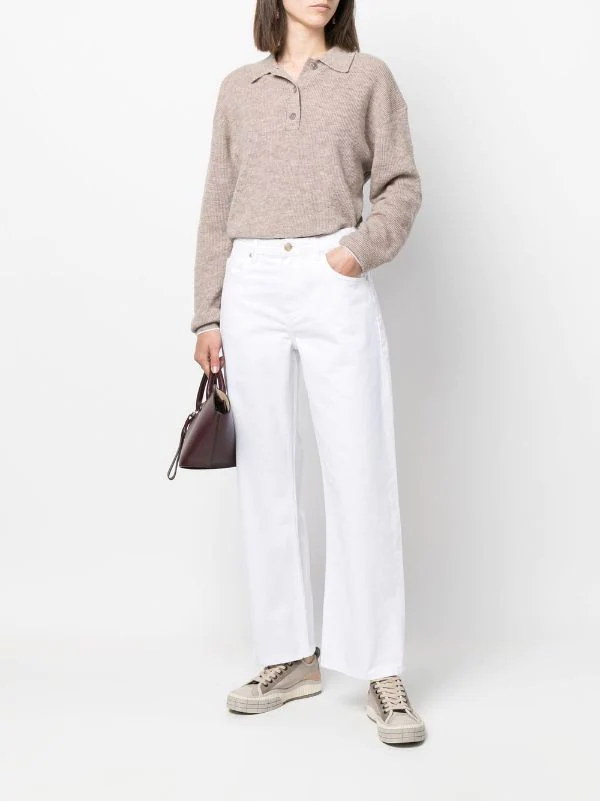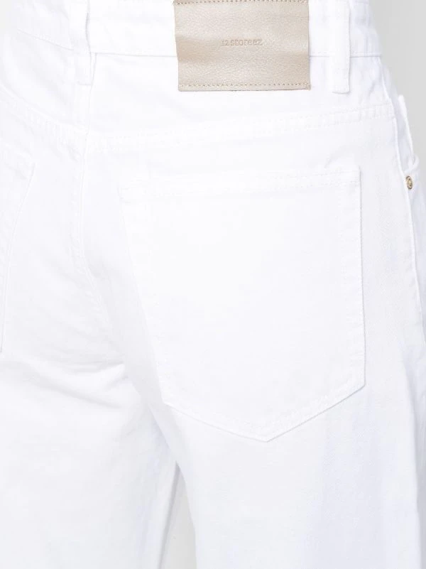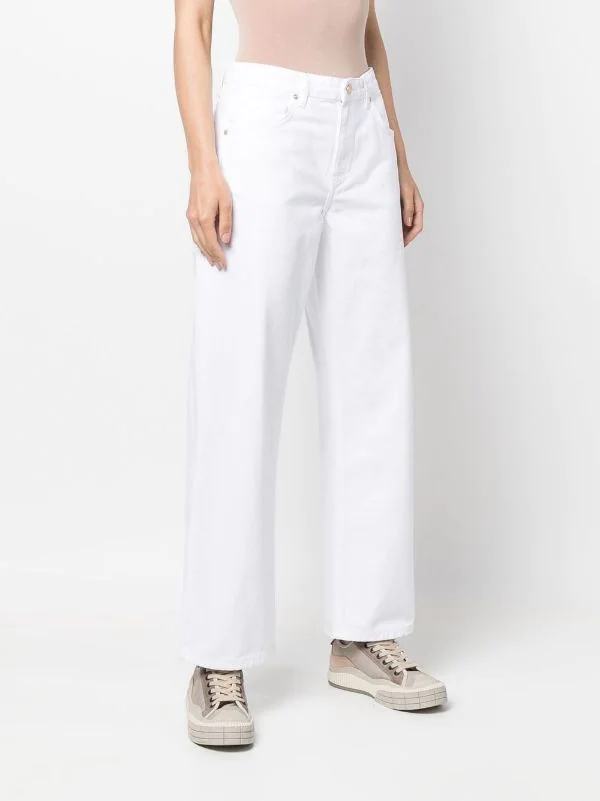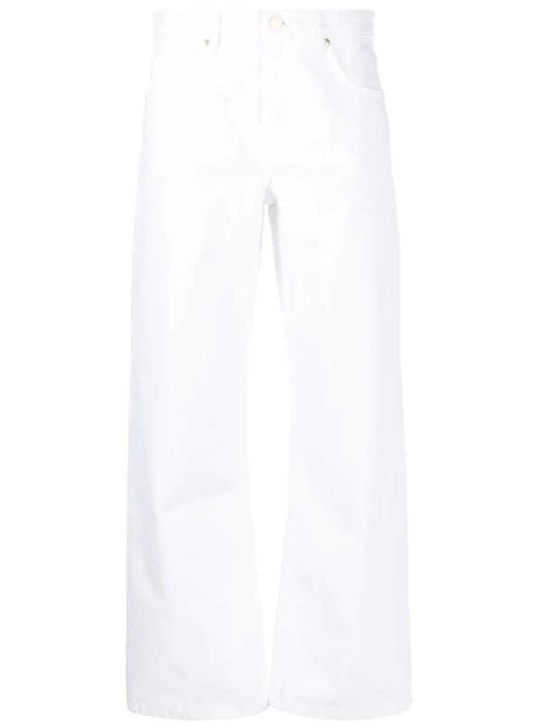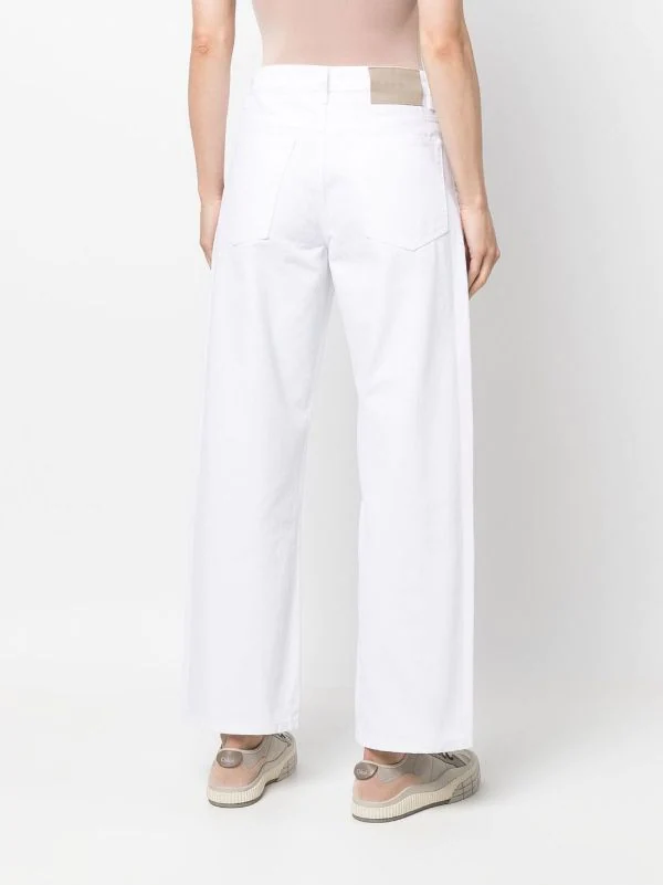 Blanc, coton biologique, taille haute, fermeture à zip et boutons sur le devant, poches latérales arrondies, coupe droite, patch logo sur l’arrière, poches arrière plaquées.