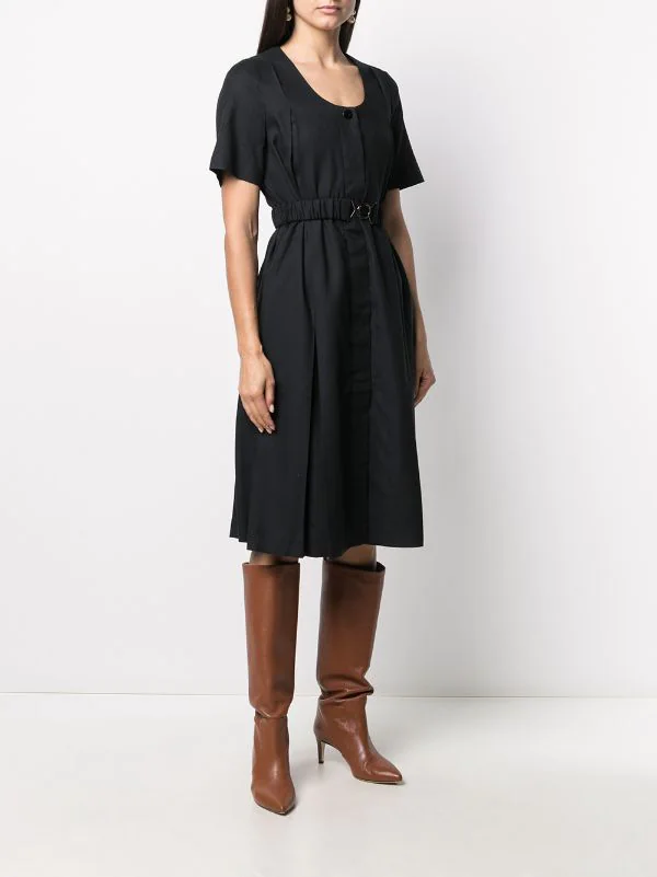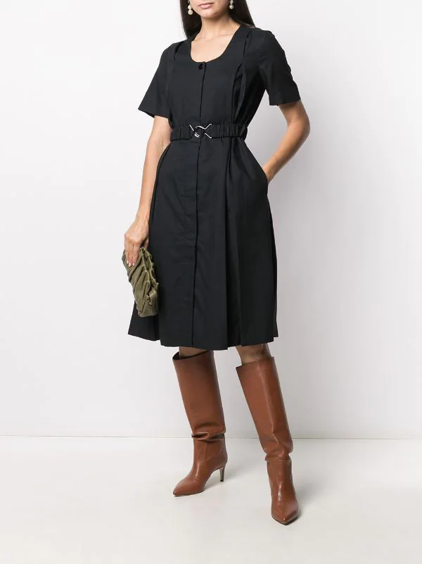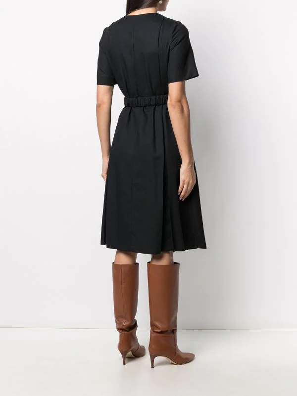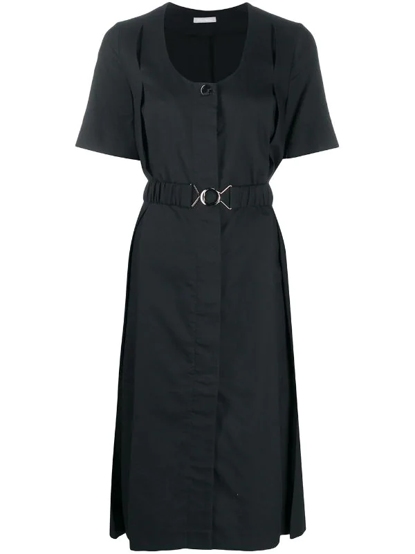 Encolure arrondie, fermeture dissimulée sur le devant, manches courtes, taille ceinturée, coupe mi-longue. Couleur : noir.