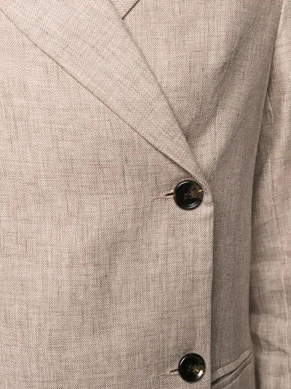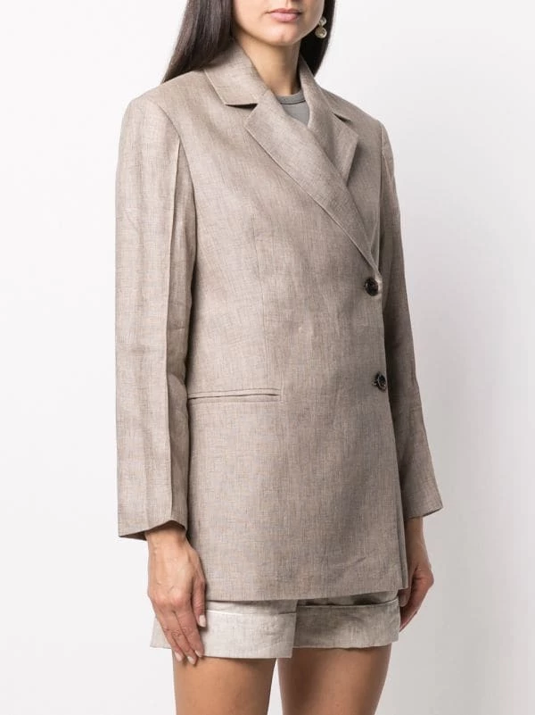 Revers crantés, boutonnière décalée sur le devant, poignets boutonnés, deux poches passepoilées avant. Matière : lin.