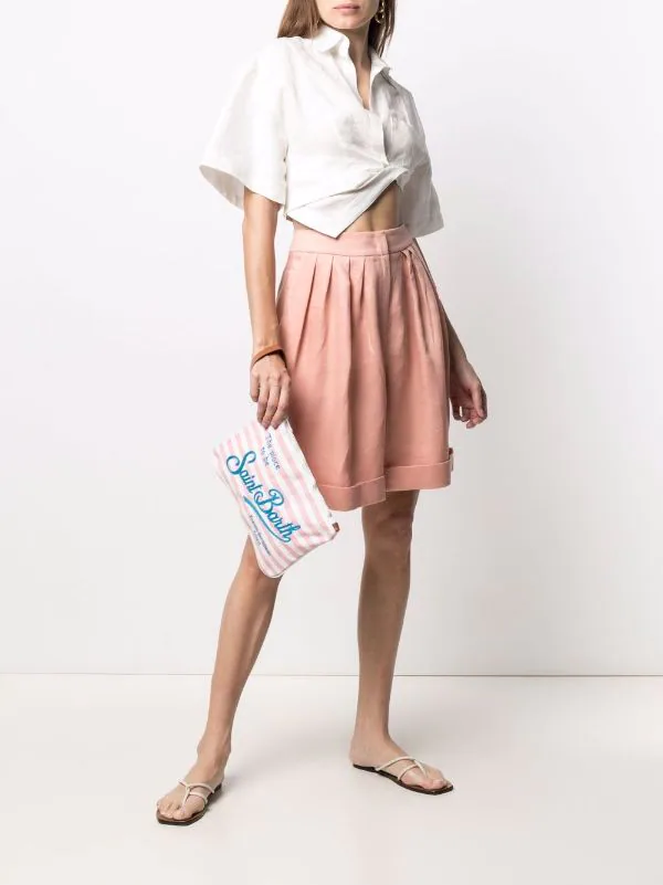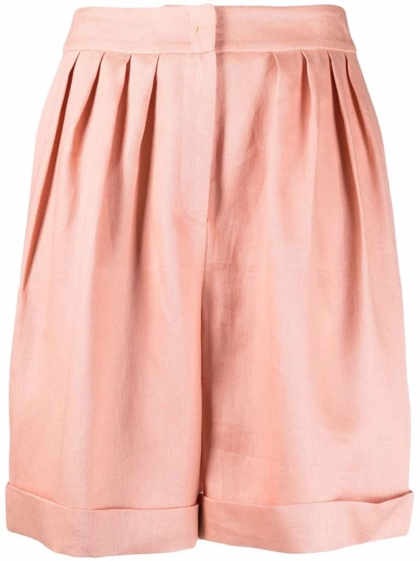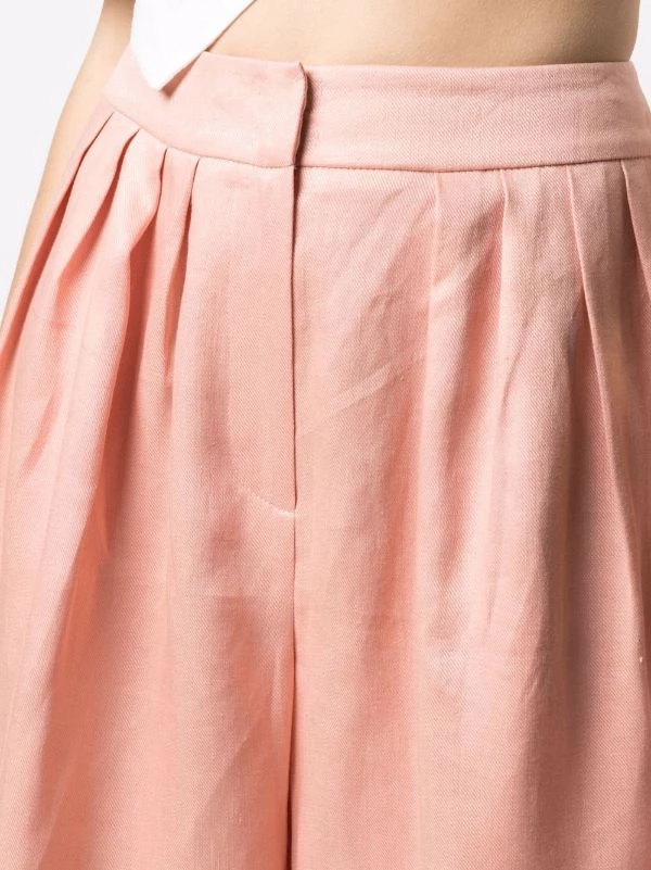 Détails de plis, fermeture dissimulée sur le devant, poches latérales fendues, ourlet retroussé. Couleur : rose. Matière : lin.