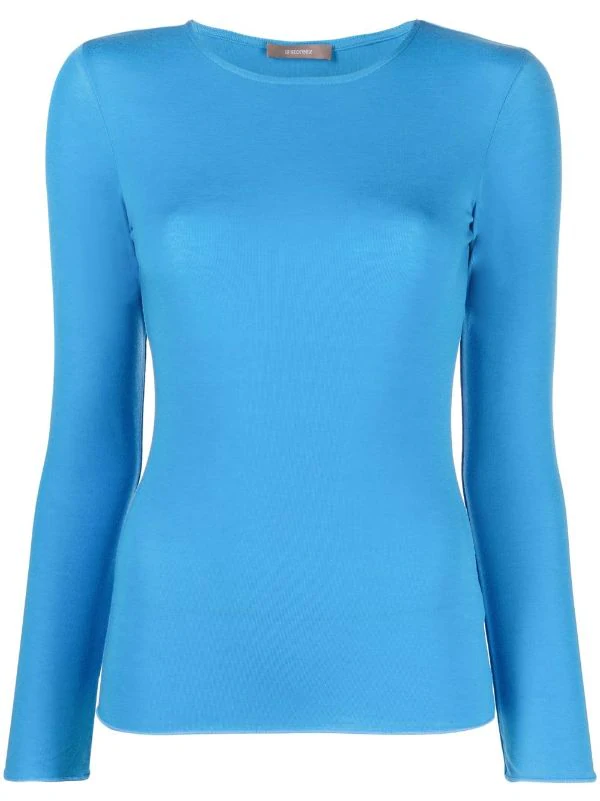 Encolure ronde, coupe slim, laine stretch, ourlet droit, manches longues.