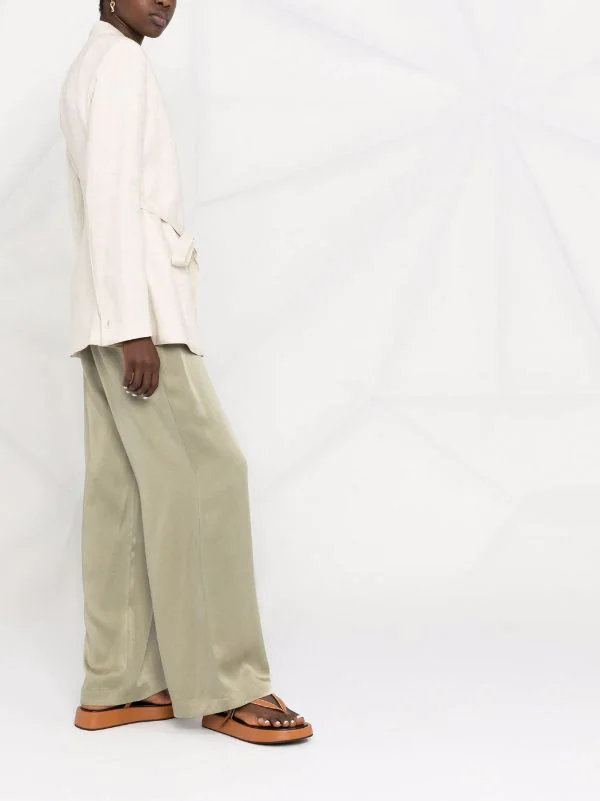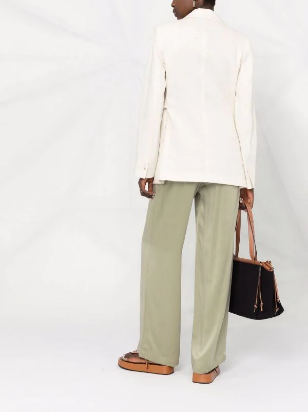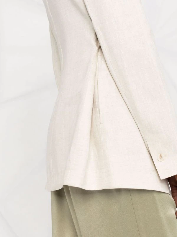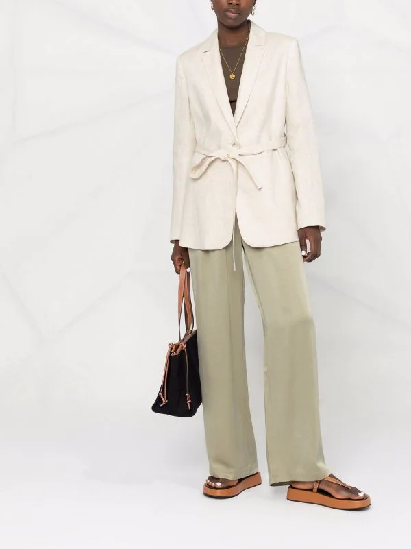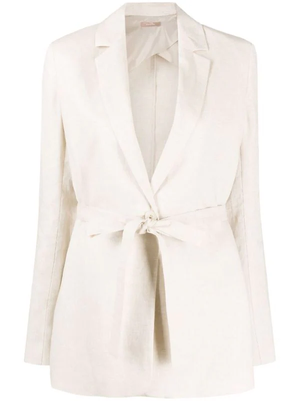 Revers crantés étroits, boutonnière sur le devant, taille ceinturée, manches longues, ourlet droit. Matière : lin.
