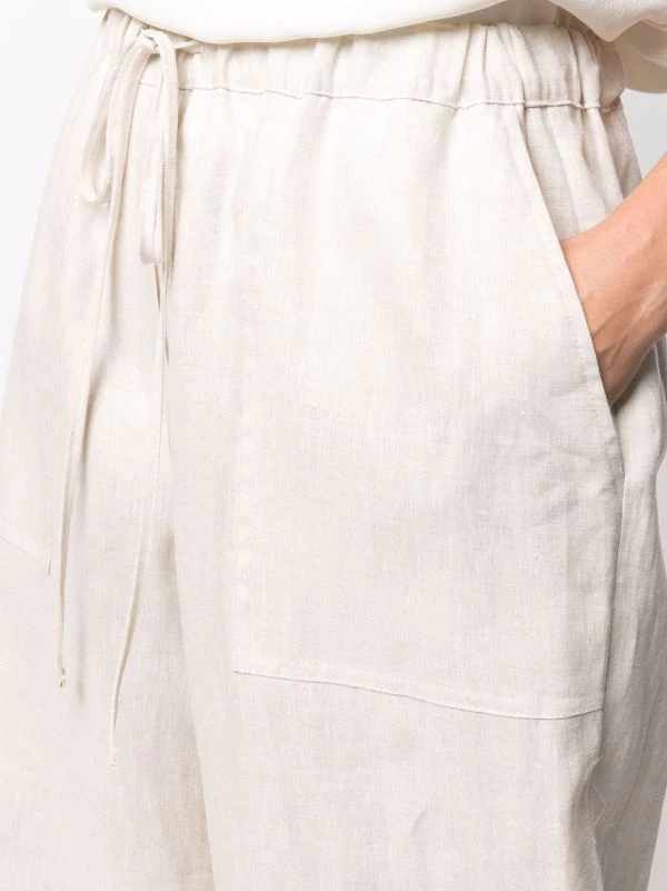 Design tissé, lien de resserrage à la taille, poches plaquées latérales, coupe droite. Matière : lin.