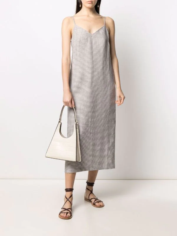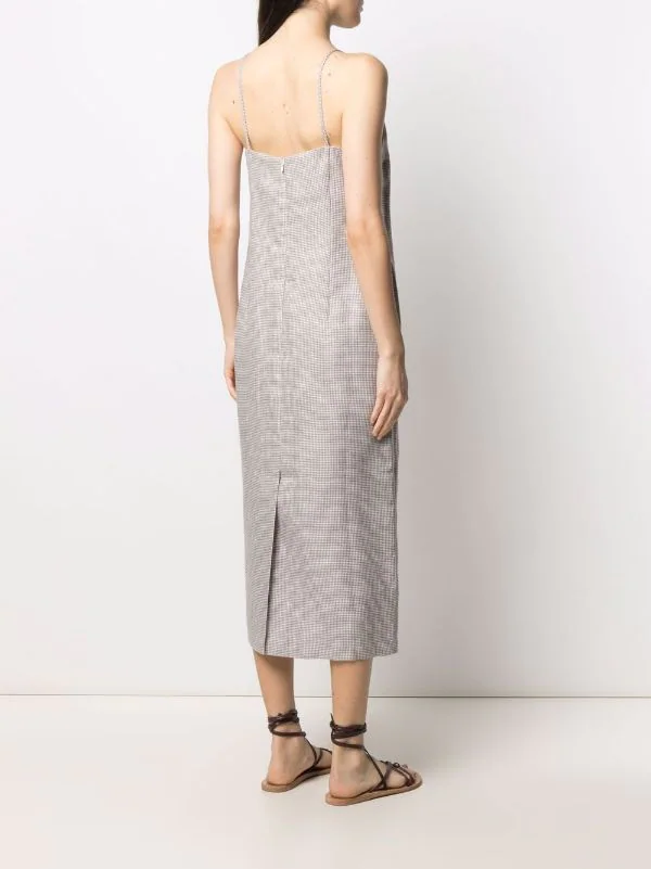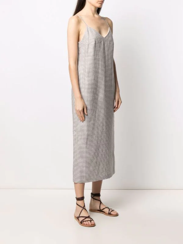 Motif pied-de-poule, col v, fines bretelles, fermeture zippée dissimulée à l’arrière. Matière : lin.