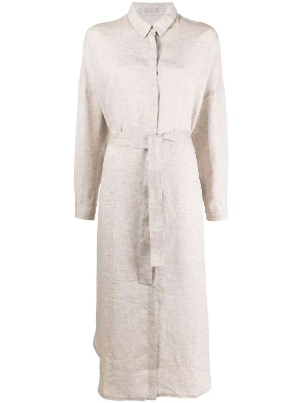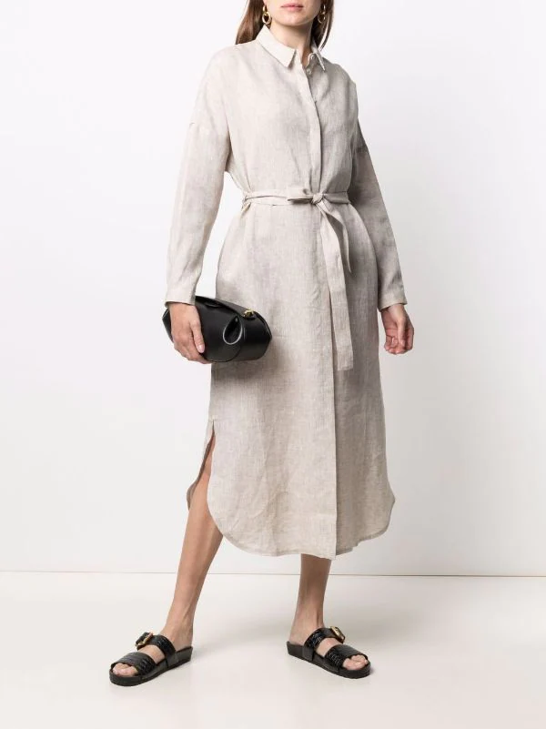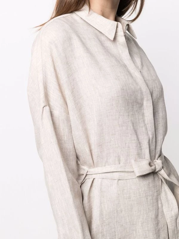 Taille nouée, fentes latérales, col montant, boutonnière sur le devant, manches longues. Matière : lin.