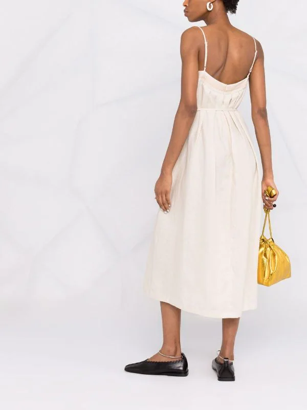 Tissu flammé, design plissé, bordure rayée, encolure carrée, brides porté épaule ajustables, fermeture zippée à l’arrière, taille ajustée, jupe évasée. Matière : lin.