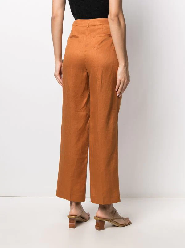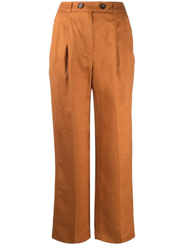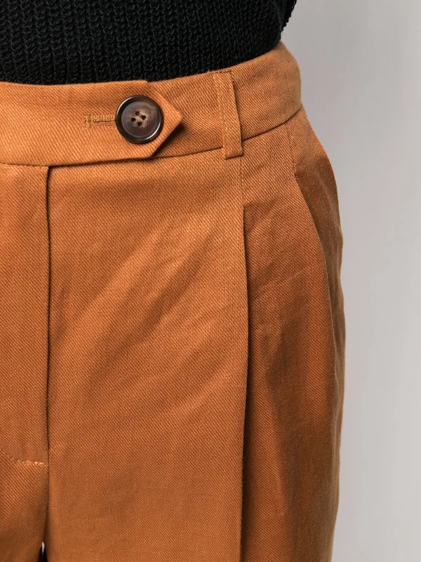 Détails de plis, taille haute, fermeture à zip et boutons sur le devant, passants de ceinture, deux poches latérales passepoilées, poches arrière passepoilées, coupe ample.